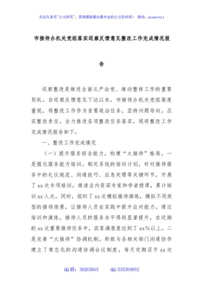 / 市接待办机关党组落实巡察反馈意见整改工作完成情况报告