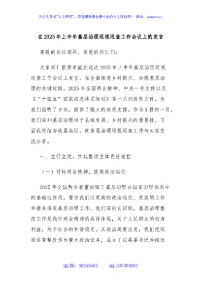 / 在2025年上半年基层治理巡视巡查工作会议上的发言