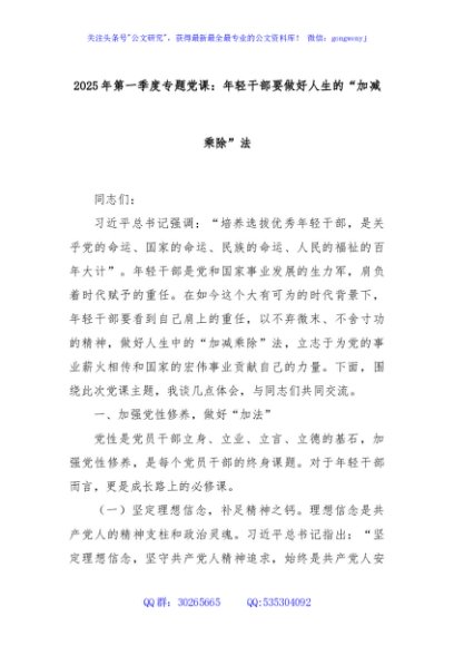 / 2025年第一季度专题党课:年轻干部要做好人生的“加减乘除”法