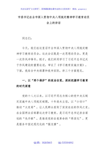 / 市委书记在全市深入贯彻中央八项规定精神学习教育动员会上的讲话