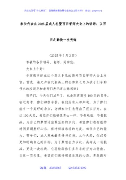 / 家长代表在2025届成人礼暨百日誓师大会上的讲话:以百日之勤换一生无悔