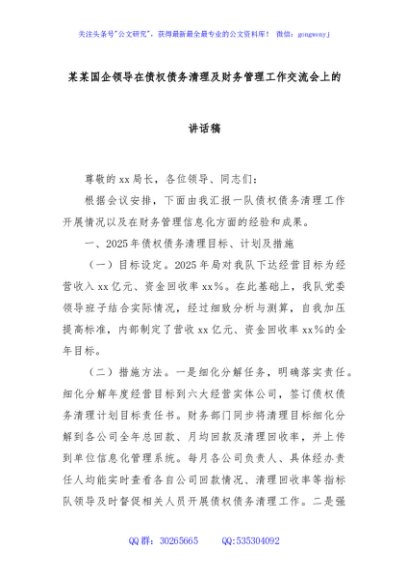 / 某某国企领导在债权债务清理及财务管理工作交流会上的讲话稿