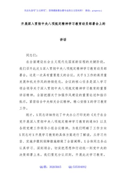 / 开展深入贯彻中央八项规定精神学习教育动员部署会上的讲话