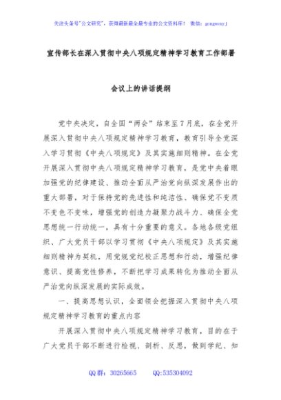 / 宣传部长在深入贯彻中央八项规定精神学习教育工作部署会议上的讲话提纲