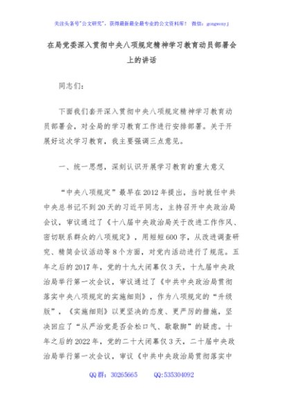 / 在局党委深入贯彻中央八项规定精神学习教育动员部署会上的讲话