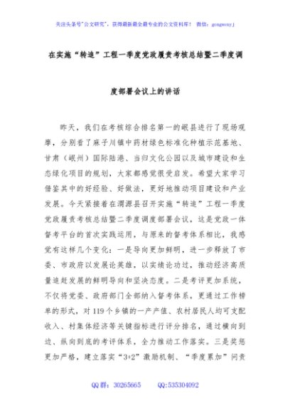 / 在实施“转追”工程一季度党政履责考核总结暨二季度调度部署会议上的讲话