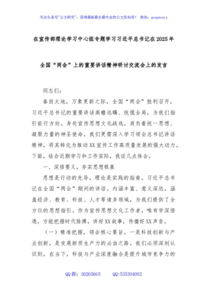 / 在宣传部理论学习中心组专题学习习近平总书记在2025年全国“两会”上的重要讲话精神研讨交流会上的发言