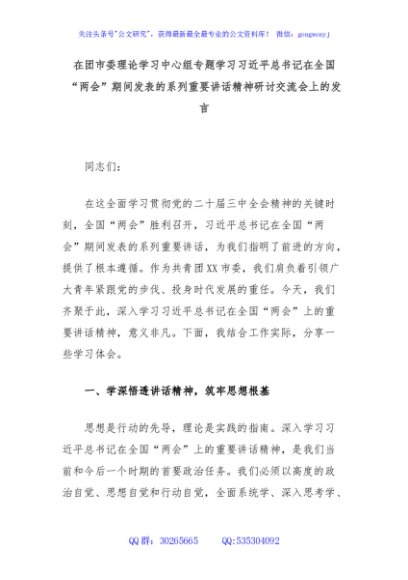 / 在团市委理论学习中心组专题学习习近平总书记在全国“两会”期间发表的系列重要讲话精神研讨交流会上的发言