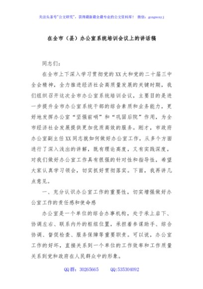 / 在全市(县)办公室系统培训会议上的讲话稿