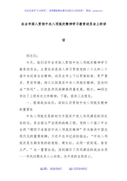 / 在全市深入贯彻中央八项规定精神学习教育动员会上的讲话