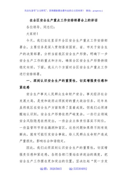 / 在全区安全生产重点工作安排部署会上的讲话