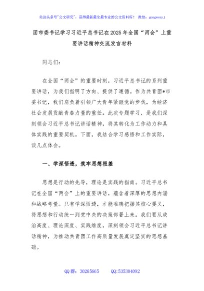 / 团市委书记学习习近平总书记在2025年全国“两会”上重要讲话精神交流发言材料