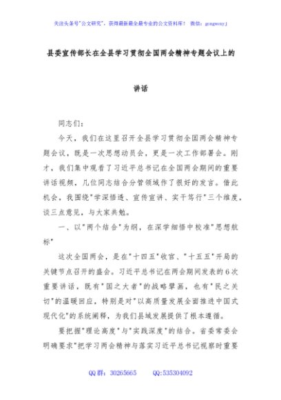 / 县委宣传部长在全县学习贯彻全国两会精神专题会议上的讲话
