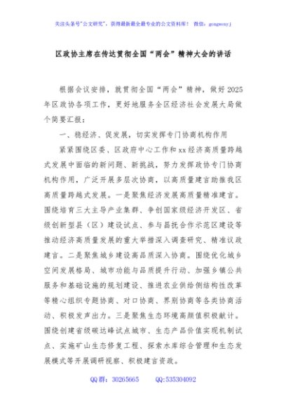 / 区政协主席在传达贯彻全国“两会”精神大会的讲话