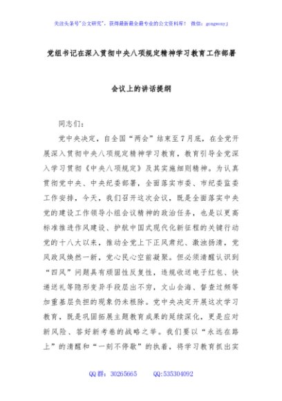 / 党组书记在深入贯彻中央八项规定精神学习教育工作部署会议上的讲话提纲