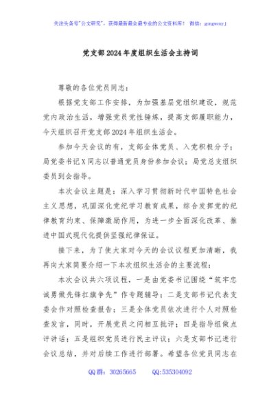 / 党支部2024年度组织生活会主持词