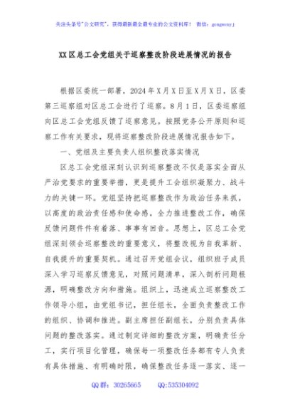 / XX区总工会党组关于巡察整改阶段进展情况的报告