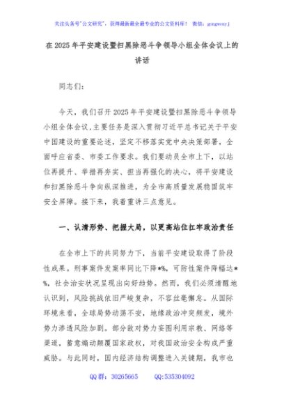/ 在2025年平安建设暨扫黑除恶斗争领导小组全体会议上的讲话