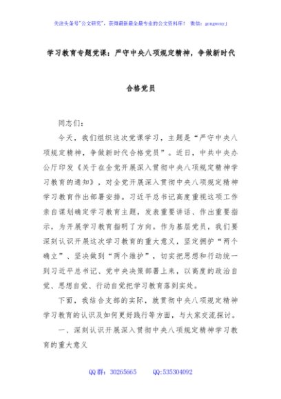 学习教育专题党课:严守中央八项规定精神,争做新时代合格党员