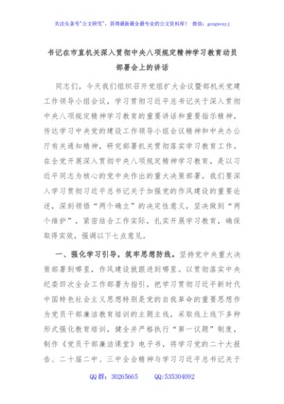 / 书记在市直机关深入贯彻中央八项规定精神学习教育动员部署会上的讲话