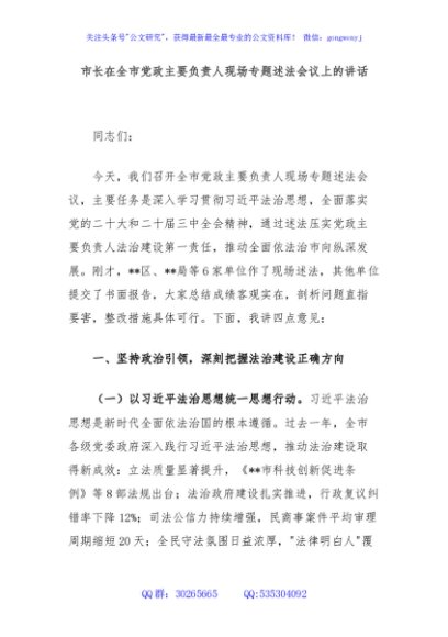 / 市长在全市党政主要负责人现场专题述法会议上的讲话