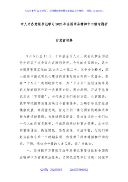 / 市人才办党组书记学习2025年全国两会精神中心组专题研讨发言材料