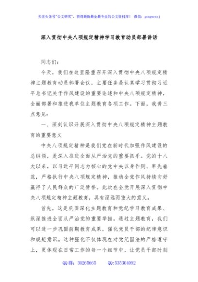 深入贯彻中央八项规定精神学习教育动员部署讲话