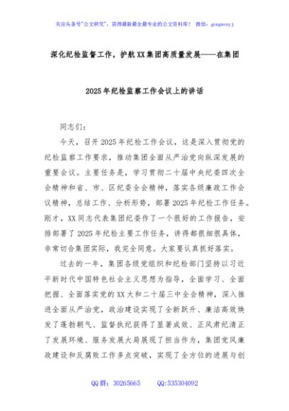 / 深化纪检监督工作,护航XX集团高质量发展——在集团2025年纪检监察工作会议上的讲话