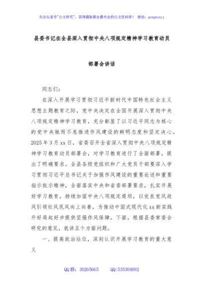 / 县委书记在全县深入贯彻中央八项规定精神学习教育动员部署会讲话