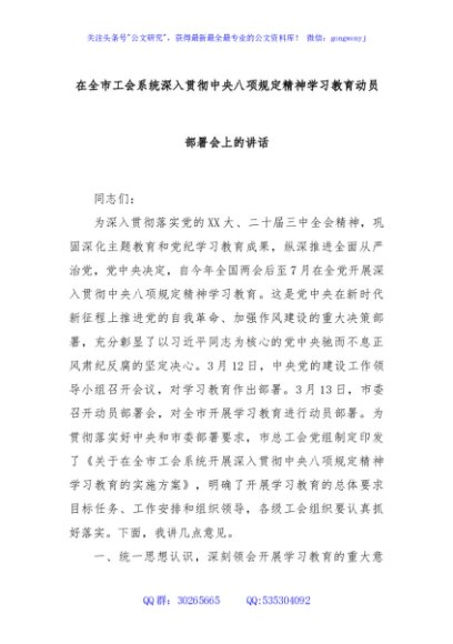 / 在全市工会系统深入贯彻中央八项规定精神学习教育动员部署会上的讲话