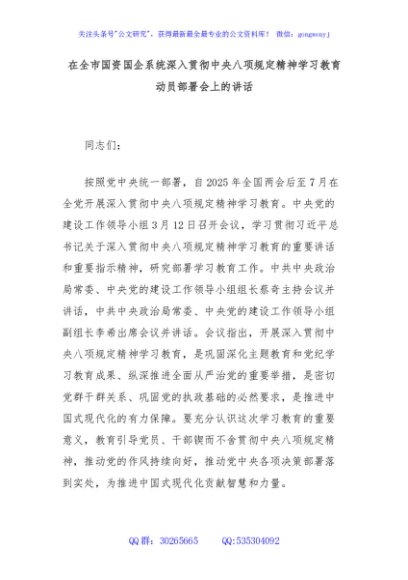 / 在全市国资国企系统深入贯彻中央八项规定精神学习教育动员部署会上的讲话
