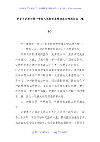 / 党委书记履行第一责任人抓好巡察整改落实情况报告(镇乡)