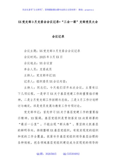 / XX党支部3月支委会会议记录+“三会一课”支部党员大会会议记录