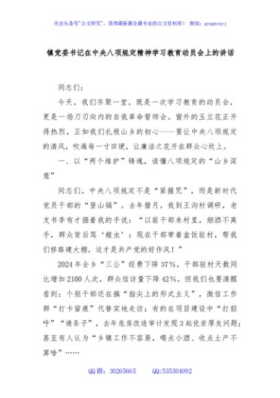 镇党委书记在中央八项规定精神学习教育动员会上的讲话