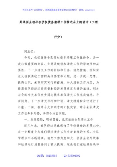 / 某某国企领导在债权债务清理工作推进会上的讲话(工程行业)