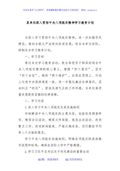 / 某单位深入贯彻中央八项规定精神学习教育计划