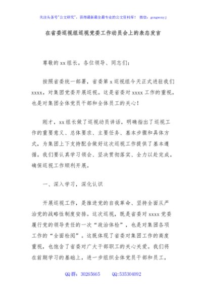 / 在省委巡视组巡视党委工作动员会上的表态发言