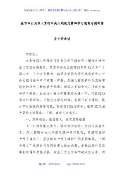 / 在市审计局深入贯彻中央八项规定精神学习教育专题部署会上的讲话