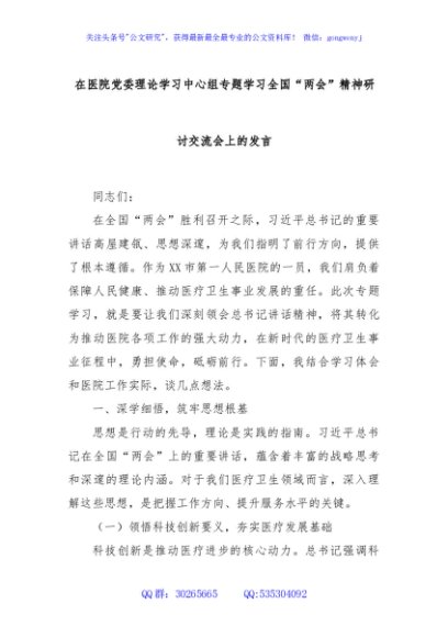 / 在医院党委理论学习中心组专题学习全国“两会”精神研讨交流会上的发言