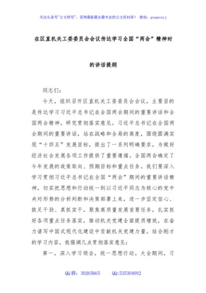 / 在区直机关工委委员会会议传达学习全国“两会”精神时的讲话提纲