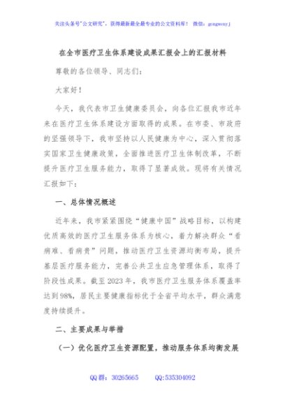 / 在全市医疗卫生体系建设成果汇报会上的汇报材料