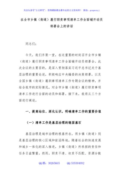 / 在全市乡镇(街道)履行职责事项清单工作全面铺开动员部署会上的讲话