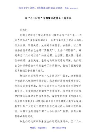 / 在“八小时外”专题警示教育会上的讲话