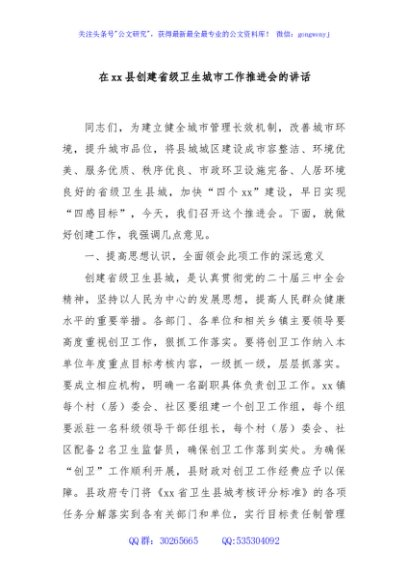 / 在xx县创建省级卫生城市工作推进会的讲话