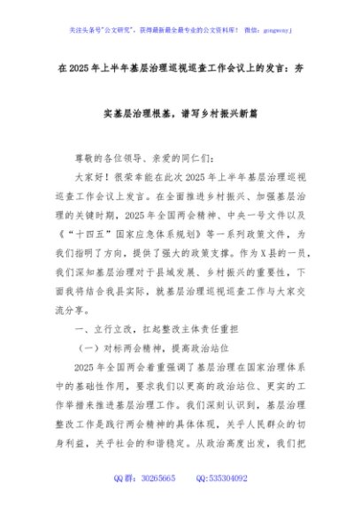 / 在2025年上半年基层治理巡视巡查工作会议上的发言:夯实基层治理根基,谱写乡村振兴新篇