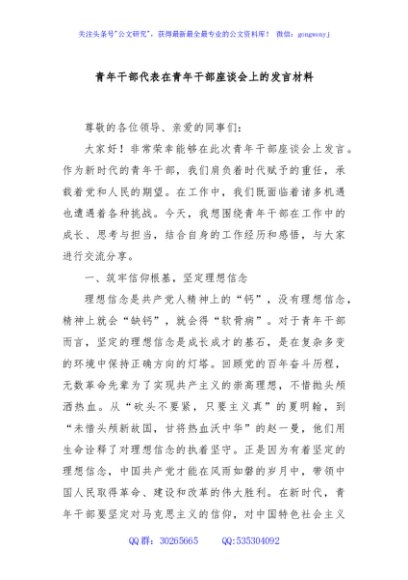 / 青年干部代表在青年干部座谈会上的发言材料