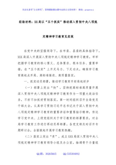 / 经验材料:XX局以“五个抓实”推动深入贯彻中央八项规定精神学习教育见实效
