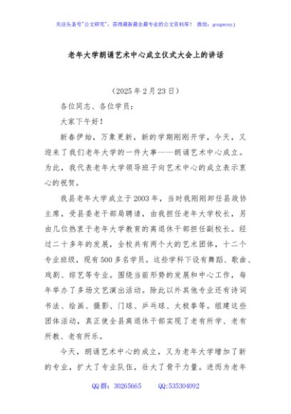 / 老年大学朗诵艺术中心成立仪式大会上的讲话