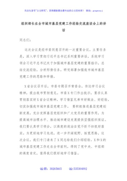 / 组织部长在全市城市基层党建工作经验交流座谈会上的讲话