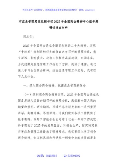 / 市应急管理局党组副书记2025年全国两会精神中心组专题研讨发言材料
